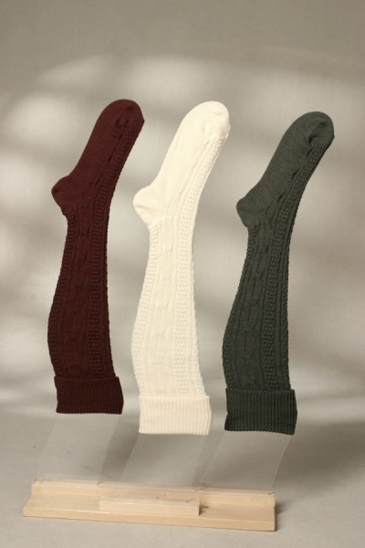 Hier präsentieren wir Ihnen besonders hochwertige Wollkniestrümpfe, die mit einem aufwendigen Perlfangdekor, Rippstreifen und Zopfmuster gearbeitet sind.